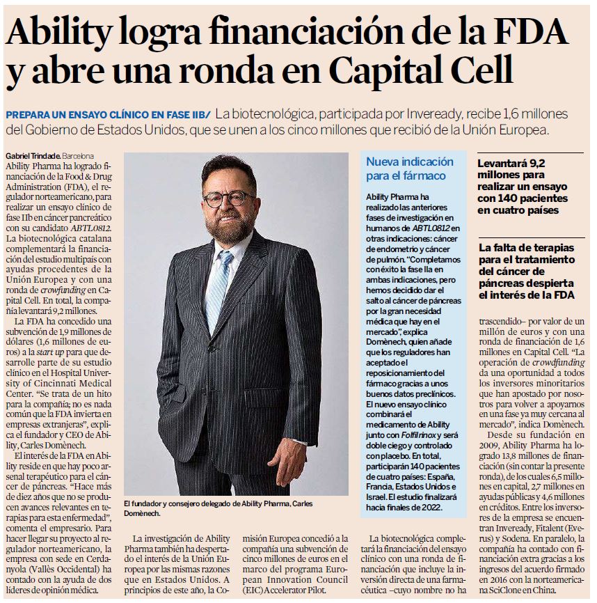 AbilityPharma Announces € 7 Million Financing Round to Advance Development of its Clinical Phase 2b Autophagy Inducer ABTL0812 in Metastatic Pancreatic Cancer + info